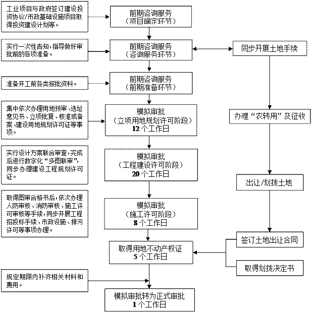 (三)依法依规,高效运行。审批部门对实行“拿地即开工”的项目实行提前介入,提供审批咨询服务。项目取得土地使用批准文件,补齐相关材料和费用后,原模拟预审意见转为正式审批意见,实现“拿地即开工”。