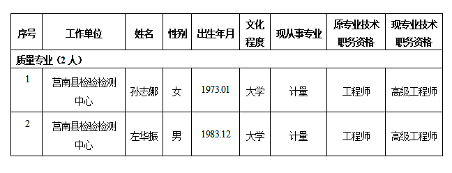 莒南县2021年度质量专业高级职务任职资格评审通过人员名单(共2人)