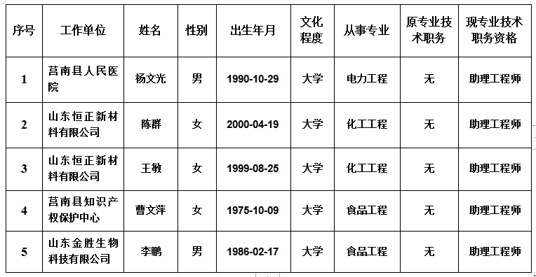 根据临沂市工业和信息化局《关于公布2022年度工程技术初级职务任职资格的通知》(临工信字〔2023〕41号)文件通知,杨文光等5名同志申报的综合工程初级专业技术职务任职资格,已经临沂市工程技术初级评审委员会2023年2月20日评审通过,公示无异议,经审核同意,现予以公布,其专业技术职务资格有效期自评审通过之日起生效。