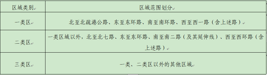 实行政府定价的城区停车设施区域类别由有关职能部门根据城市规划、路网分布、道路交通运行状况等确定(详见附件1),并适时进行调整。