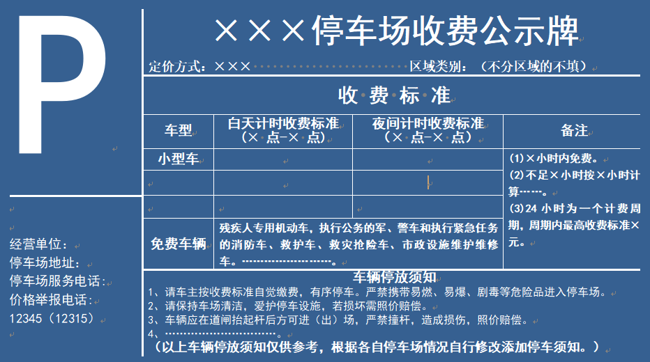 (三)机动车停车服务收费实行明码标价制度。停车设施经营者应当在停车设施出入口、缴费地点等显著位置设置公示牌(栏),公示停车设施名称、收费单位、服务电话、监督机关、计费方式、收费标准、免费时限及优惠政策、投诉举报电话等信息,接受社会监督。停车场收费公示牌(栏)参考式样为:收费公示牌(栏)带有P字,蓝底白字(详见附件4)。