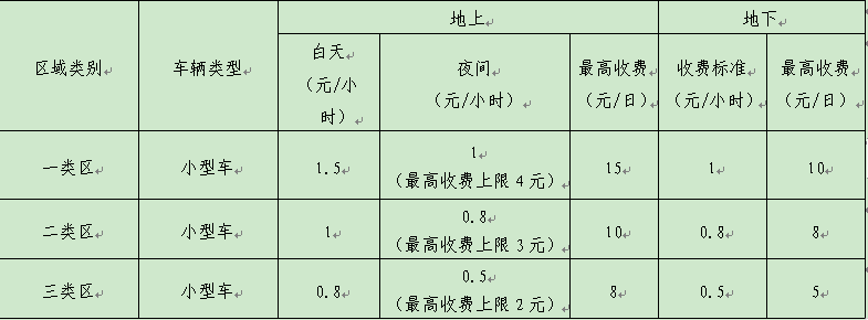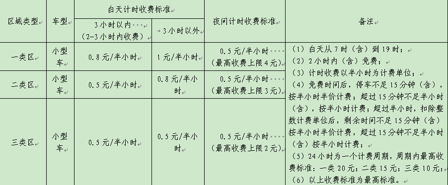 备注:(1)白天从7时(含)到19时,夜间从19时(含)到次日7时;(2)2小时内(含)免费;(3)计时收费以小时为计费单位;(4)免费时间后,停车不足30分钟(含),按1小时半价计费;超过30分钟不足1小时(含),按1小时计费;超过1小时,扣除整数计费单位后,剩余时间不足30分钟(含),按1小时半价计费;超过30分钟不足1小时(含),按1小时计费;(5)实行日(连续24小时)最高限价方式;(6)中型、大型车辆停车服务收费标准分别按小型车辆的1.5倍、2倍确定;(7)以上收费标准为最高标准。