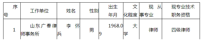 李怀兵同志申报的律师初级专业技术职务任职资格,已经市律师、公证员专业技术职务资格中(初)级评审委员会2018年12月27日评审通过,公示无异议,县人力资源和社会保障局审核同意,现予以公布,其有效期自2019年3月12日起生效。