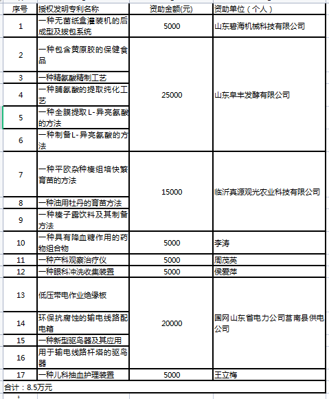 根据莒南县人民政府《关于加强知识产权工作的意见》(莒南政发〔2014〕56号)和县财政局、县市场监管局关于印发《莒南县专利发展专项资金管理办法的通知》(莒南财〔2019〕21号)文件规定,县市场监管局下发了《关于申请2018年度发明专利授权资助和奖励的通知》,在单位和个人自愿申请的基础上,经研究,决定对2018年获得授权发明专利的单位和个人进行资助,具体资助名单和资助金额详见附件。