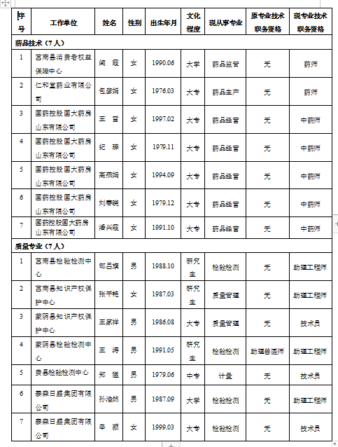 附:莒南县2023年度药品技术、质量专业初级职务任职资格评审通过人员名单