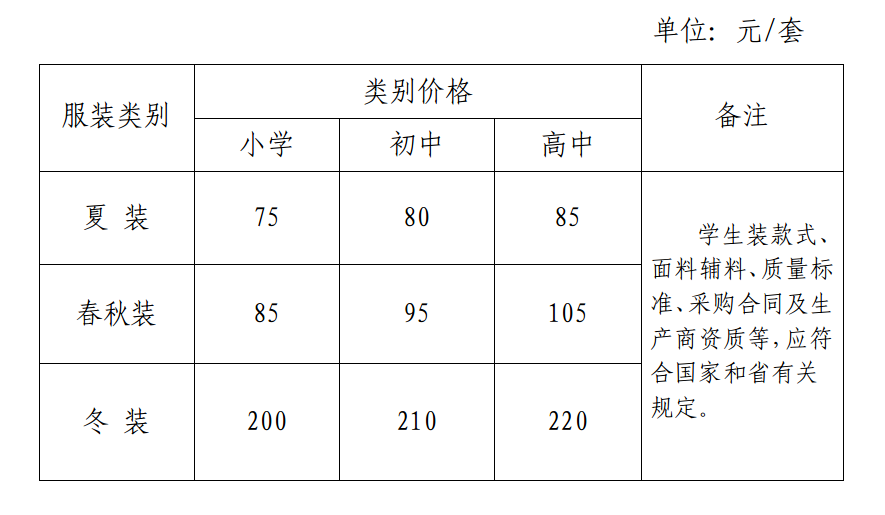 初中:夏季校服每套不高于80元,秋季校服每套不高于95元,冬季棉服每套不高于210元;