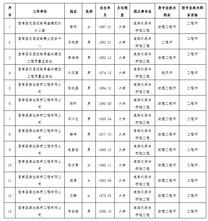 2020年度交通工程系列中级通过人员名单(共13人)