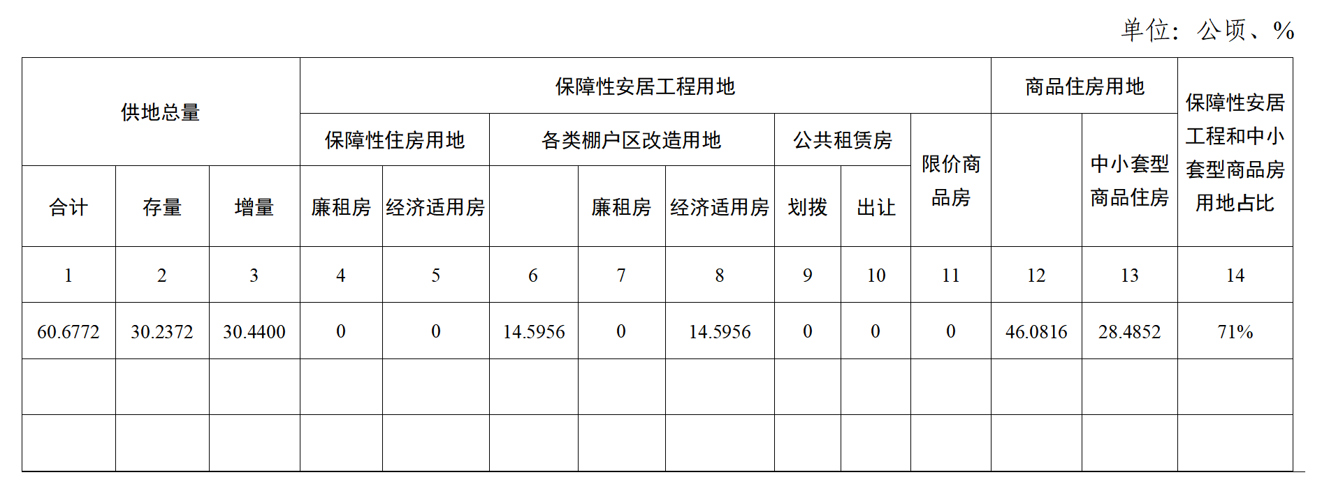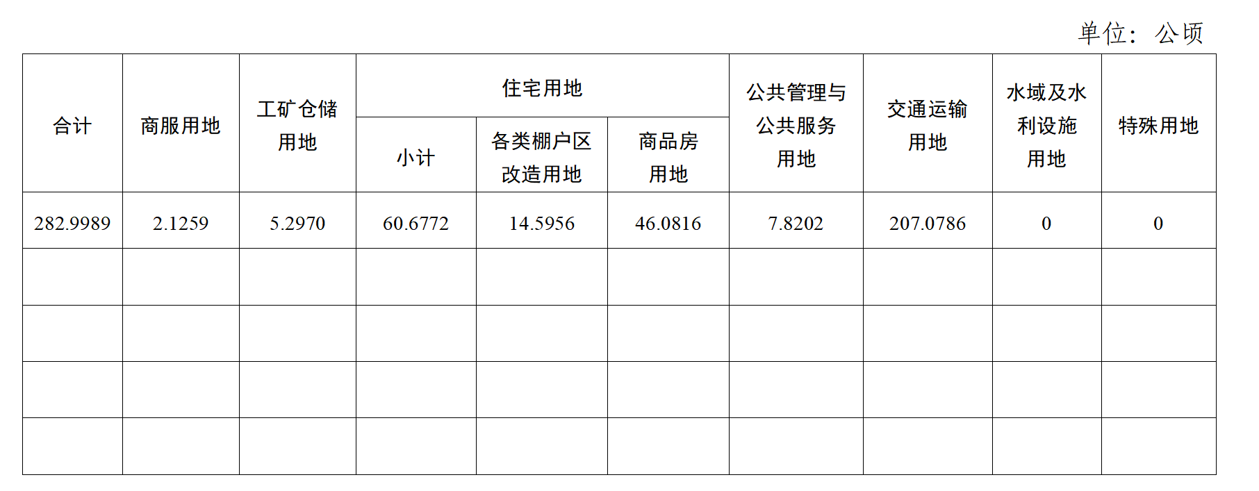 2022年度全县计划供应国有建设用地282.9989公顷。其中,住宅用地60.6772公顷(含保障性安居工程用地14.5956公顷),商服用地2.1259公顷,工矿仓储用地5.2970公顷,公共管理与公共服务用地7.8202公顷,交通运输用地207.0786公顷。