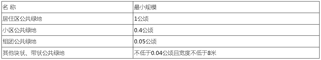 第三十二条 居住用地中除满足上述绿地率的控制指标外,还应有集中公共绿地,包括居住区公共绿地、小区公共绿地、组团公共绿地和其他块状、带状公共绿地,其规模应符合下表规定: