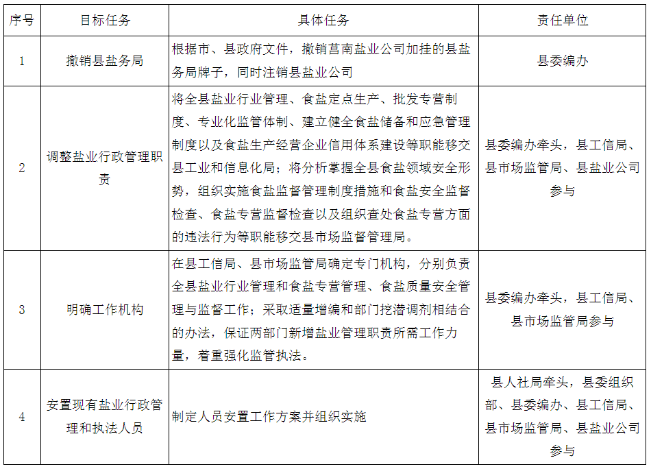 坚持政企分开原则,撤销县盐务局,同时注销县盐业公司;确定县工业和信息化局为县政府盐业主管部门,负责全县盐业行业管理、食盐专营管理工作;县市场监督管理局为县政府食盐质量安全监管部门,负责食盐质量安全管理与监督工作,承担食盐专营工作监督检查责任,组织查处食盐专营方面的违法行为。县工信局、市场监管局要与公安、司法、卫健等部门各司其职、密切合作,依法加强食盐安全监管,健全盐业管理和质量安全监管体系并落实到位。(责任单位:县工信局、县委编办、县市场监管局、县人社局、县财政局、县公安局、县卫健局等)