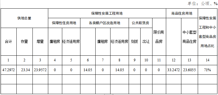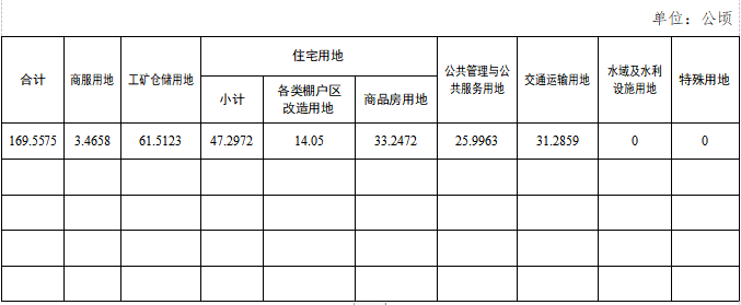 2023年度全县计划供应国有建设用地169.5575公顷。其中,住宅用地47.2972公顷(含保障性安居工程用地14.05公顷),商服用地3.4658公顷,工矿仓储用地61.5123公顷,公共管理与公共服务用地25.9963公顷,交通运输用地31.2859公顷。