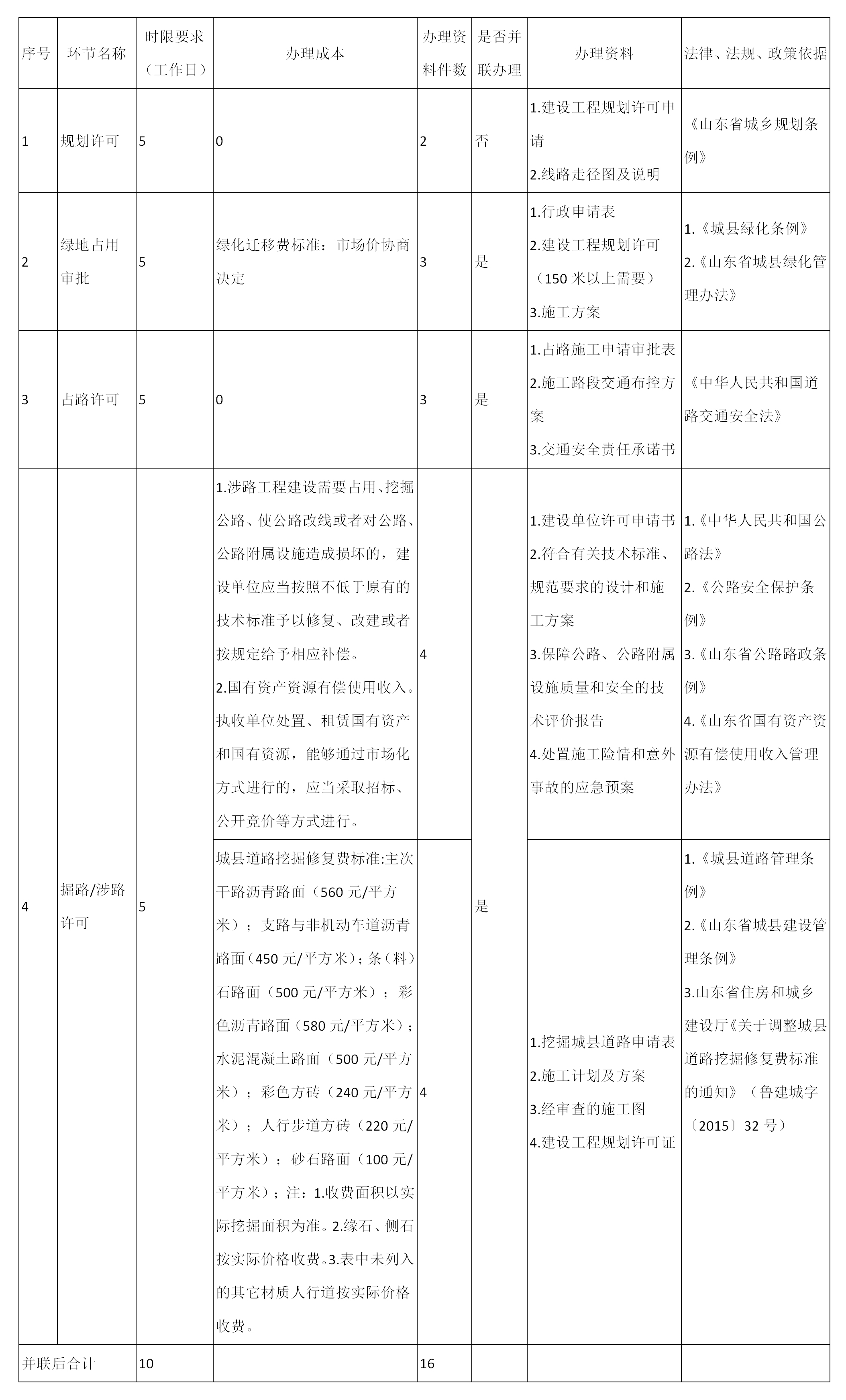 (三)行政审批办理。电力接入工程如需办理规划、绿地占用、占路和掘路/涉路等行政许可的,除规划许可外其余并联办理,10个工作日内完成全部行政审批(不含涉铁路、涉高速审批时限)。除以下事项外,各级各部门不得增加审批环节、前置条件和收费项目。