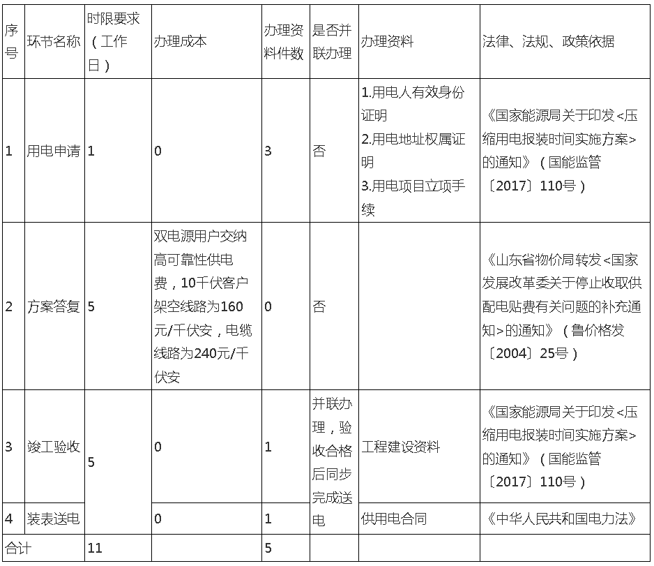 10千伏用户、低压用户申请电力接入,由电网企业“一窗受理”。通过优化办理流程,将行政审批环节精简至3个以内,除规划许可外其余并联办理,审批总时长不超过10个工作日。10千伏用户、低压用户电力接入的电网内部环节分别精简至3个和2个,办理时长分别压减至11个和3个工作日。10千伏用户、低压用户的审批全过程时长分别不超过21个和12个工作日。自正式受理用电申请至送电(用户自身实施的受电工程工期、民事协调延误时间不计入),10千伏用户、低压用户平均总时长分别不超过43个和18个工作日(不含涉铁路、涉高速审批时限)。加快35千伏及以上电力工程行政审批办理速度。