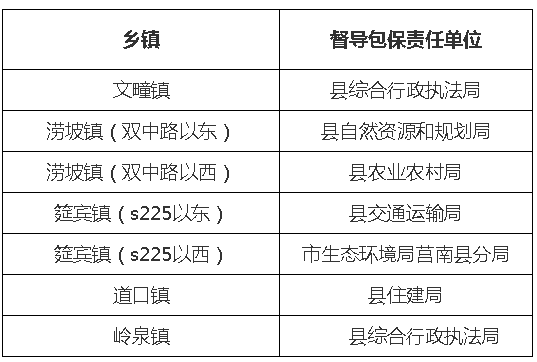 (四)强化督导考核。把铁路沿线环境治理纳入乡村振兴、城乡环卫一体化、文明村镇、卫生城镇等考核指标体系,增加考核权重。实行县高铁沿线及火车站周边环境综合整治工作领导小组成员单位分镇督导检查包保制度(具体分工见附件),定期通报各镇工作进展情况,不定期组织调查暗访,及时调整增补高铁沿线环境问题清单,督促责任单位整改。在重点整治阶段,实地督导次数每周不少于2次;在全面治理阶段,每月不少于2次。