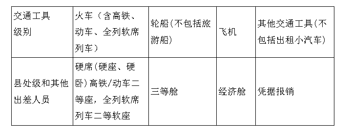 第七条 出差人员应当按规定乘坐交通工具。乘坐交通工具的等级见下表: