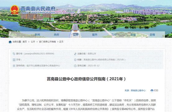 坚持以莒南县政府门户网站“莒南县人民政府”为政务公开第一平台,以“临沂市公路事业发展中心”网站、“临沂公路”微信公众号为政务公开第二平台,保障政府信息公开及时、规范。