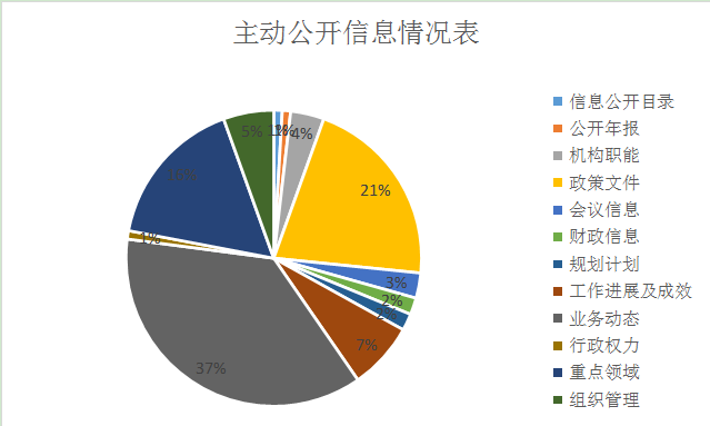 我局按照上级要求,本年度主动公开政府信息总数109条(项),其中,信息公开目录1条、占比0.92%;公开年报1条,占比0.92%;机构职能4条、占比3.67%;政策文件23条、占比21.10%;会议信息3条、占比2.75%;财政信息2条、占比1.83%;规划计划2条、占比1.83%;工作进展及成效8条、占比7.34%;业务动态40条、占比36.70%;行政权力1条、占比0.92%;重点领域18条、占比16.51%;组织管理6条占比5.50%。
