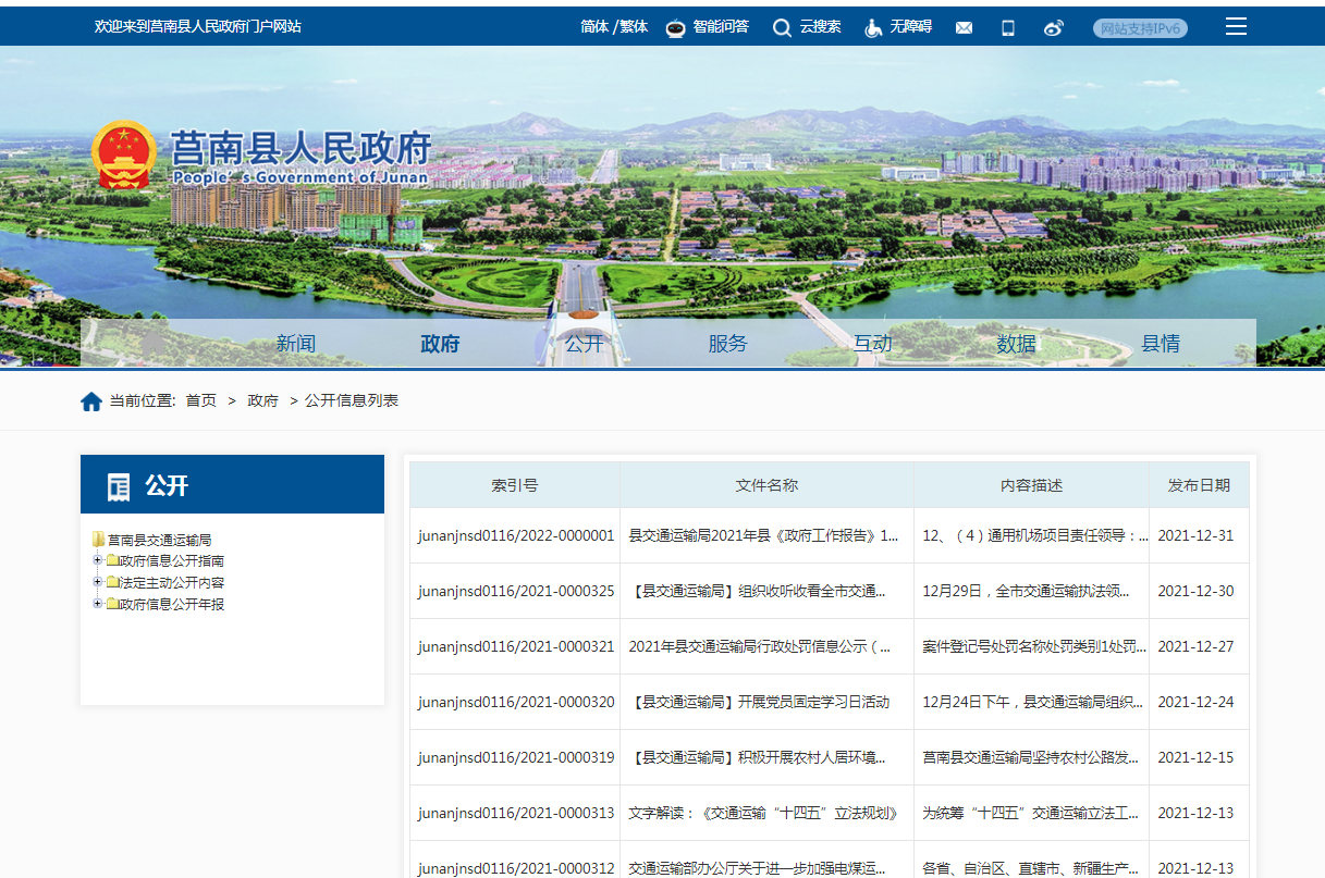 莒南县政府门户网站为县交通运输局政府信息主要公开平台,县交通运输局积极维护县政府网站内容建设,严格按照政府信息主动公开基本目录进行各类信息发布。
