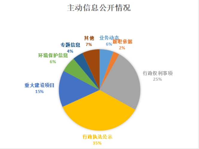 本年度,主要通过政府门户网站主动公开各类信息约2002条,主要包括各类审批公示、政策文件及解读、财政预决算、规划计划、公共资源交易公告(公示)等。其中:业务动态110条;占比5.50%,履职依据50条,占比2.50%;行政权力事项502条,占比25.07%;行政执法公示703,占比35.11%;重大建设项目292条,占比14.59%;环境保护信息123条,占比6.14%;专题信息84条,占比4.20%;其他138条,占比6.89%。