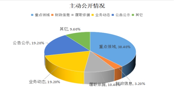 动公开各类信息约125条,主要包括各类审批公示、政策文件及解读、财政预决算、优化服务、部门动态等。其中重点领域信息48条,占比38.4%,涉及行政执法公示、重大建设项目审批、医疗卫生等;财政信息4条,占比3.2%;履职依据13条,占比10.4%;业务动态24条,占比19.2%;公告公示24条,占比19.2%;其他12条,占比9.6%。