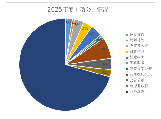 截至2025年度末,累计主动公开各类信息123条,政策文件3条,规划计划1条,决策预公开4条,财政信息4条,行政权力5条,优化服务1条,建议提案公开1条,行政执法公示9条,公告公示5条,业务动态87条,政府开放日3条。