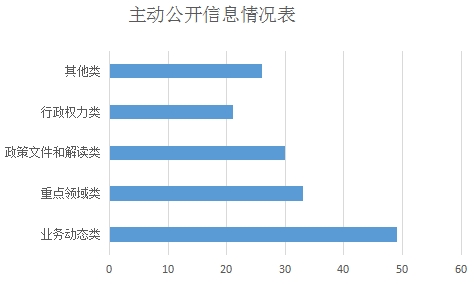 (一)主动公开情况。进一步加强政务公开实效,2020年度,主动公开各类信息159条,较之去年公开工作大幅提升,主要分布在以下几个方面,业务动态类49条,占比30.82%;重点领域33条,占比20.75%;政策文件和解读类30条,占比18.88%;行政权力21条,占比13.21;其他各类26条,占比16.35%。