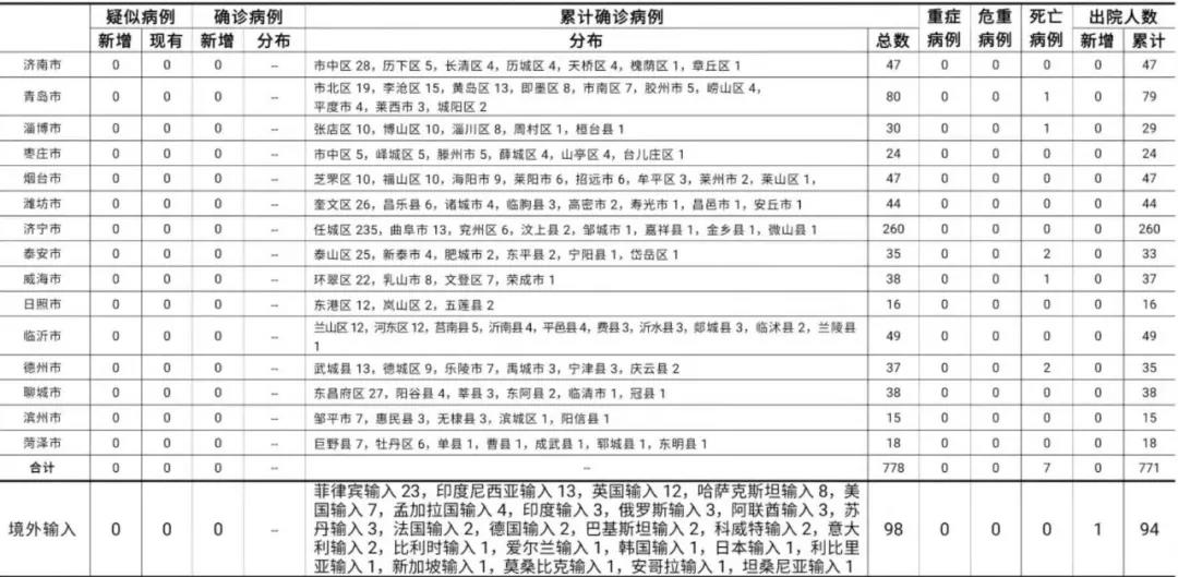 山东无新增本地疑似病例、确诊病例。累计报告确诊病例778例,死亡7例,治愈出院771例。