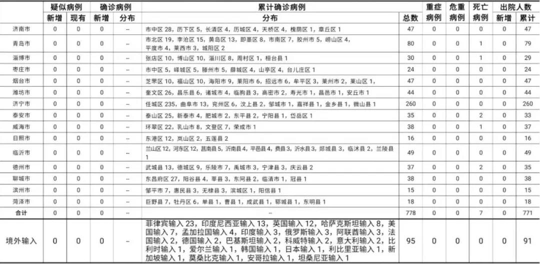 山东无新增本地疑似病例、确诊病例。累计报告确诊病例778例,死亡7例,治愈出院771例。