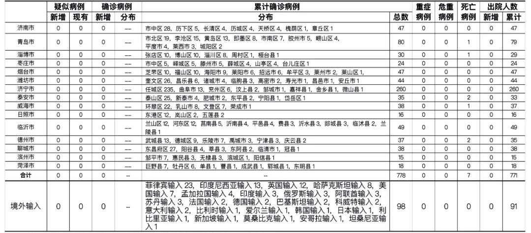 山东无新增本地疑似病例、确诊病例。累计报告确诊病例778例,死亡7例,治愈出院771例。