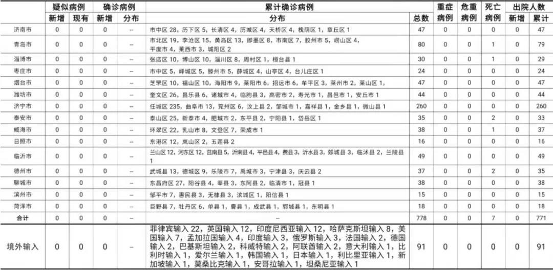 2021年3月13日0时至24时:山东无新增本地疑似病例、确诊病例。累计报告确诊病例778例,死亡7例,治愈出院771例。山东无新增境外输入疑似病例、确诊病例。累计报告境外输入确诊病例91例,治愈出院91例。山东无新增无症状感染者。正在隔离观察治疗的无症状感染者3例(境外输入3例)。2020年以来全省共追踪到密切接触者29444人,目前尚有49人正在接受医学隔离观察。详见下表(单位:例):