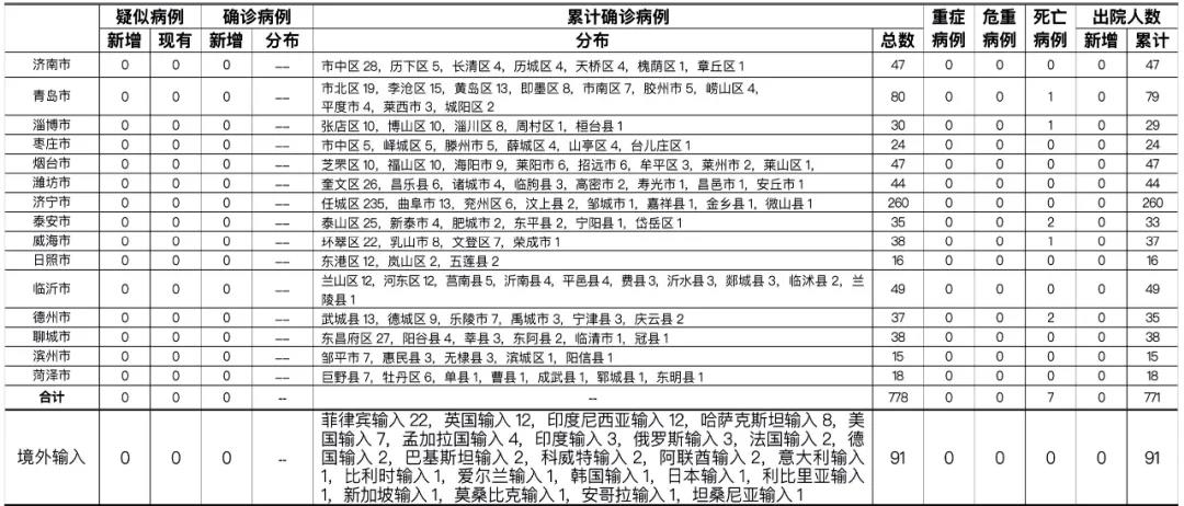 2021年3月18日0时至24时:山东无新增本地疑似病例、确诊病例。累计报告确诊病例778例,死亡7例,治愈出院771例。山东无新增境外输入疑似病例、确诊病例。累计报告境外输入确诊病例91例,治愈出院91例。山东无新增无症状感染者。正在隔离观察治疗的无症状感染者3例(境外输入3例),出院1例(境外输入)。2020年以来全省共追踪到密切接触者29486人,目前尚有83人正在接受医学隔离观察。详见下表(单位:例):
