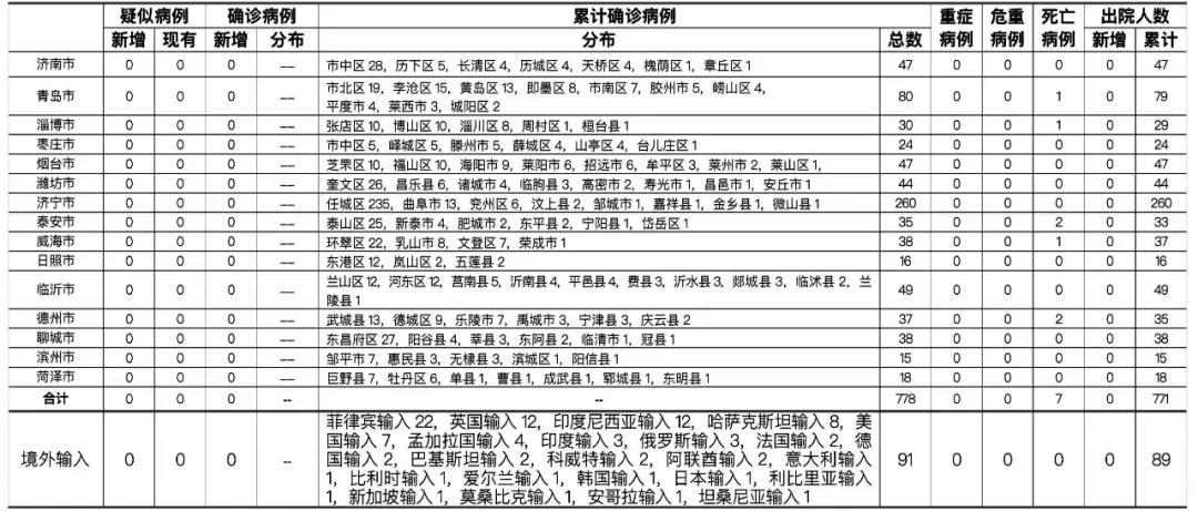 山东省本地病例按确诊时医院所在县区统计,境外输入病例单独统计。