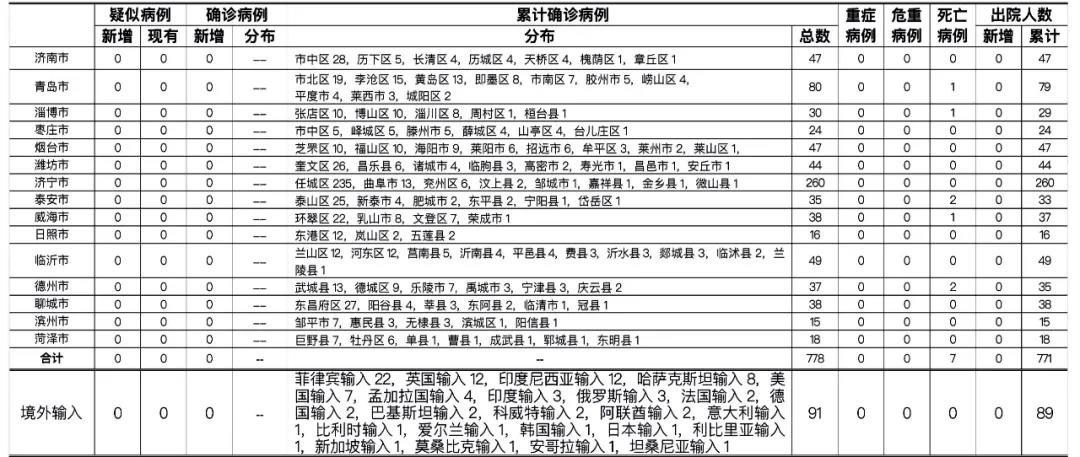2021年3月2日0时至24时:山东无新增本地疑似病例、确诊病例。累计报告确诊病例778例,死亡7例,治愈出院771例。山东无新增境外输入疑似病例、确诊病例。累计报告境外输入确诊病例91例,治愈出院89例。正在住院治疗的确诊病例2例。山东无新增无症状感染者。正在隔离观察治疗的无症状感染者3例(境外输入2例,省外输入1例)。2020年以来全省共追踪到密切接触者29340人,目前尚有120人正在接受医学隔离观察。详见下表(单位:例):