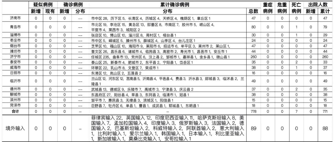 山东省本地病例按确诊时医院所在县区统计,境外输入病例单独统计。