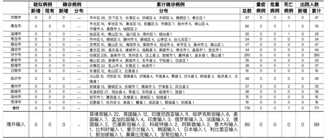 山东省本地病例按确诊时医院所在县区统计,境外输入病例单独统计。
