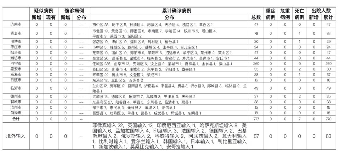 备注:1.山东省本地病例按确诊时医院所在县区统计,境外输入病例单独统计。