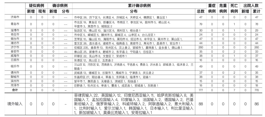 备注:1.山东省本地病例按确诊时医院所在县区统计,境外输入病例单独统计。