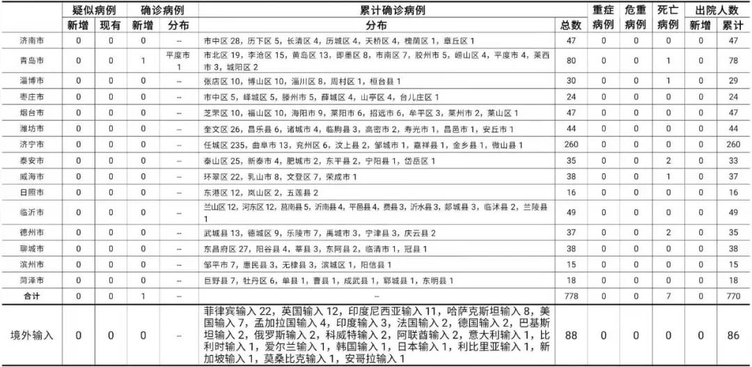 山东省本地病例按确诊时医院所在县区统计,境外输入病例单独统计。