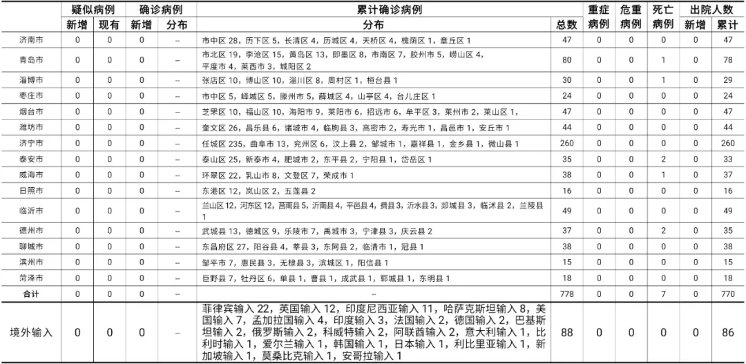 备注:1.山东省本地病例按确诊时医院所在县区统计,境外输入病例单独统计。