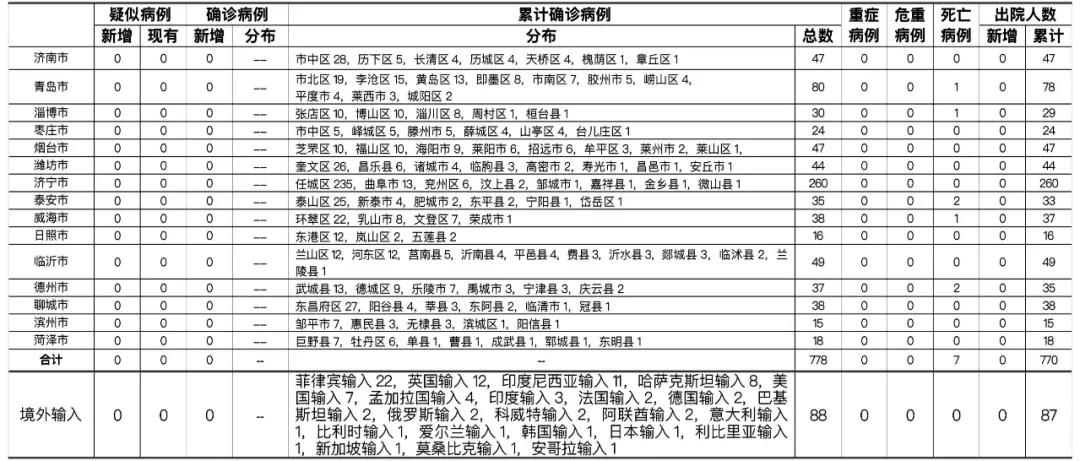 山东省本地病例按确诊时医院所在县区统计,境外输入病例单独统计。