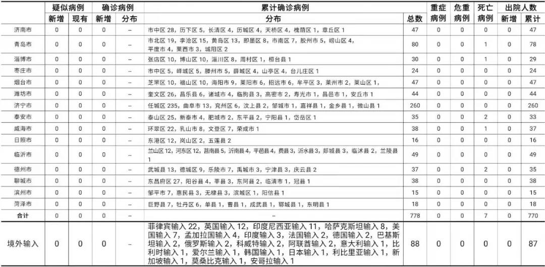 山东无新增本地疑似病例、确诊病例。累计报告确诊病例778例,死亡7例,治愈出院770例。正在住院治疗的确诊病例1例(省外输入1例)。山东无新增境外输入疑似病例、确诊病例。累计报告境外输入确诊病例88例,治愈出院87例。正在住院治疗的确诊病例1例。山东无新增无症状感染者。正在隔离观察治疗的无症状感染者4例(境外输入2例,省外输入2例)。2020年以来全省共追踪到密切接触者29062人,目前尚有395人正在接受医学隔离观察。详见下表(单位:例):