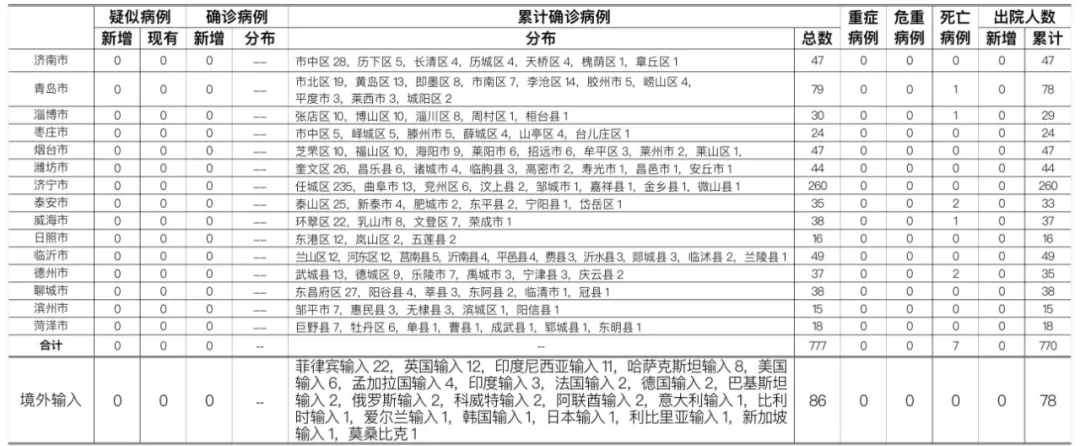 备注:1.山东省本地病例按确诊时医院所在县区统计,境外输入病例单独统计。
