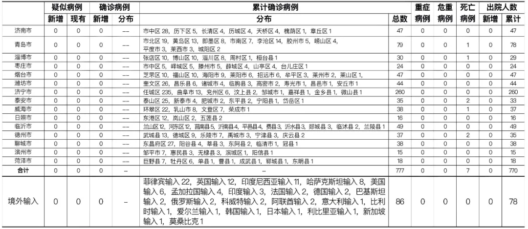 备注:1.山东省本地病例按确诊时医院所在县区统计,境外输入病例单独统计。