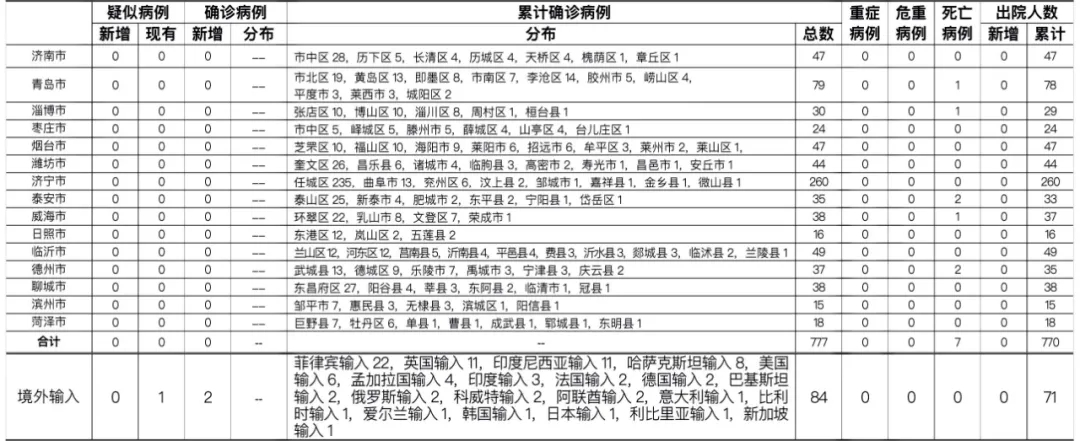 备注:1.山东省本地病例按确诊时医院所在县区统计,境外输入病例单独统计。