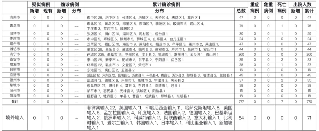 备注:1.山东省本地病例按确诊时医院所在县区统计,境外输入病例单独统计。