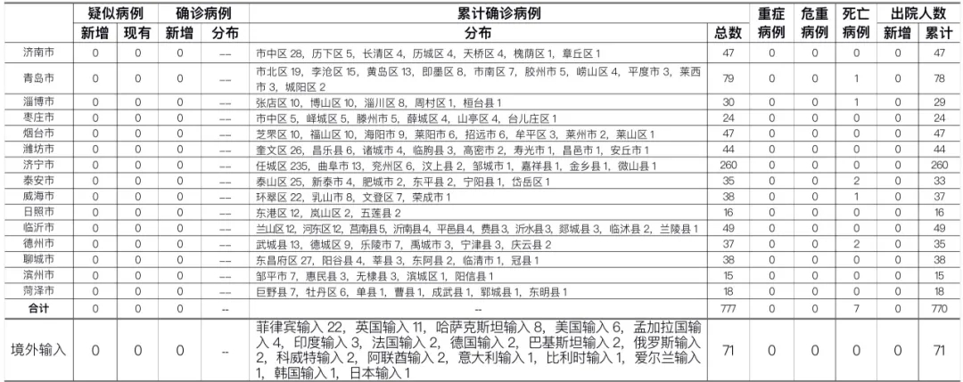 备注:1.山东省本地病例按确诊时医院所在县区统计,境外输入病例单独统计。