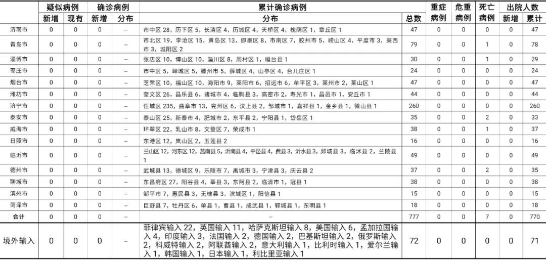 山东无新增本地疑似病例、确诊病例。累计报告确诊病例777例,死亡7例,治愈出院770例。