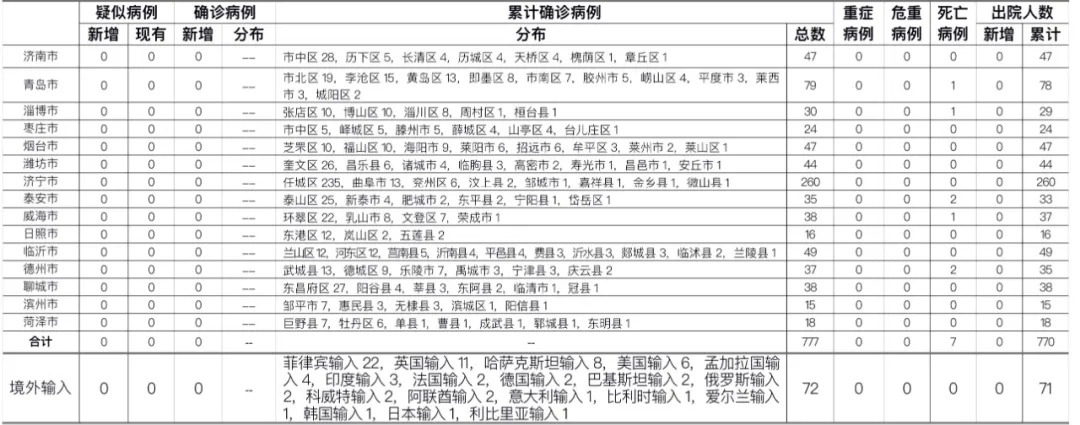 备注:1.山东省本地病例按确诊时医院所在县区统计,境外输入病例单独统计。