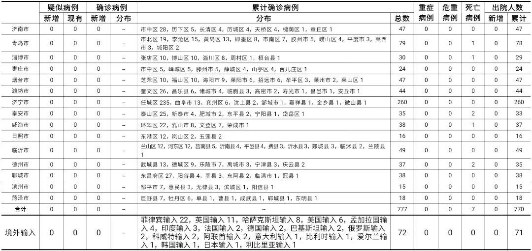 备注:1.山东省本地病例按确诊时医院所在县区统计,境外输入病例单独统计。