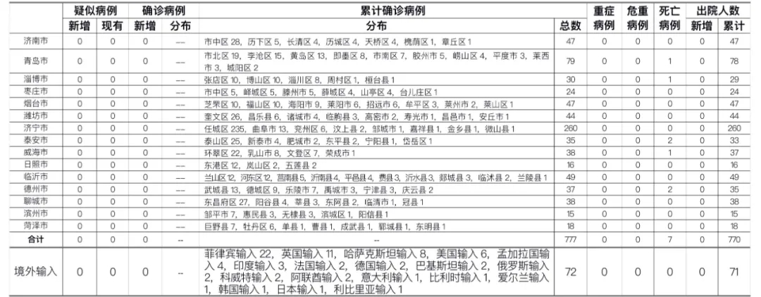 山东无新增本地疑似病例、确诊病例。累计报告确诊病例777例,死亡7例,治愈出院770例。